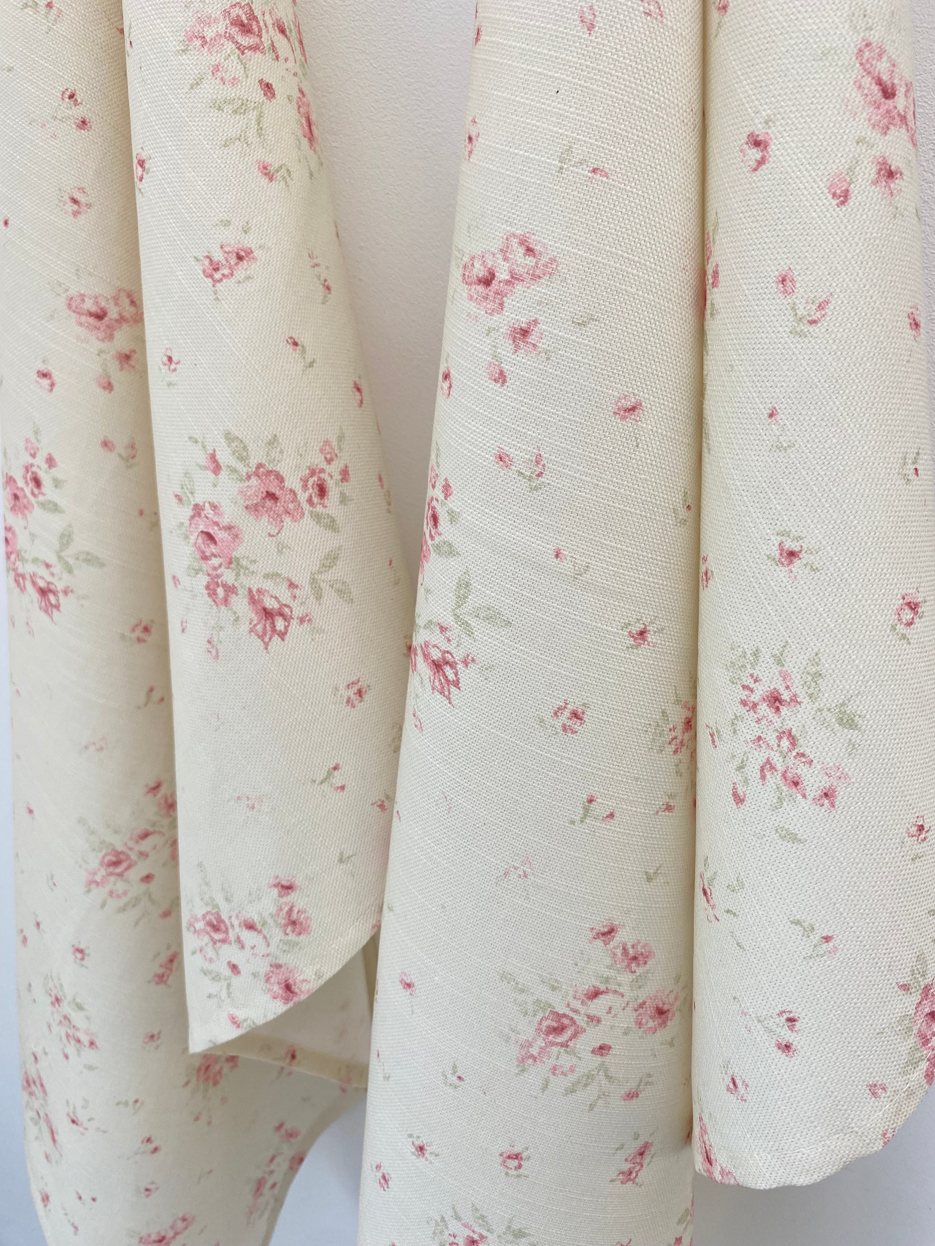 Pink wildflowers and faded green leaves on beige linen, they lend a quiet romance to your everyday cooking.